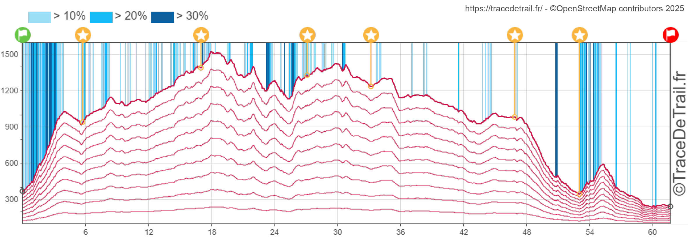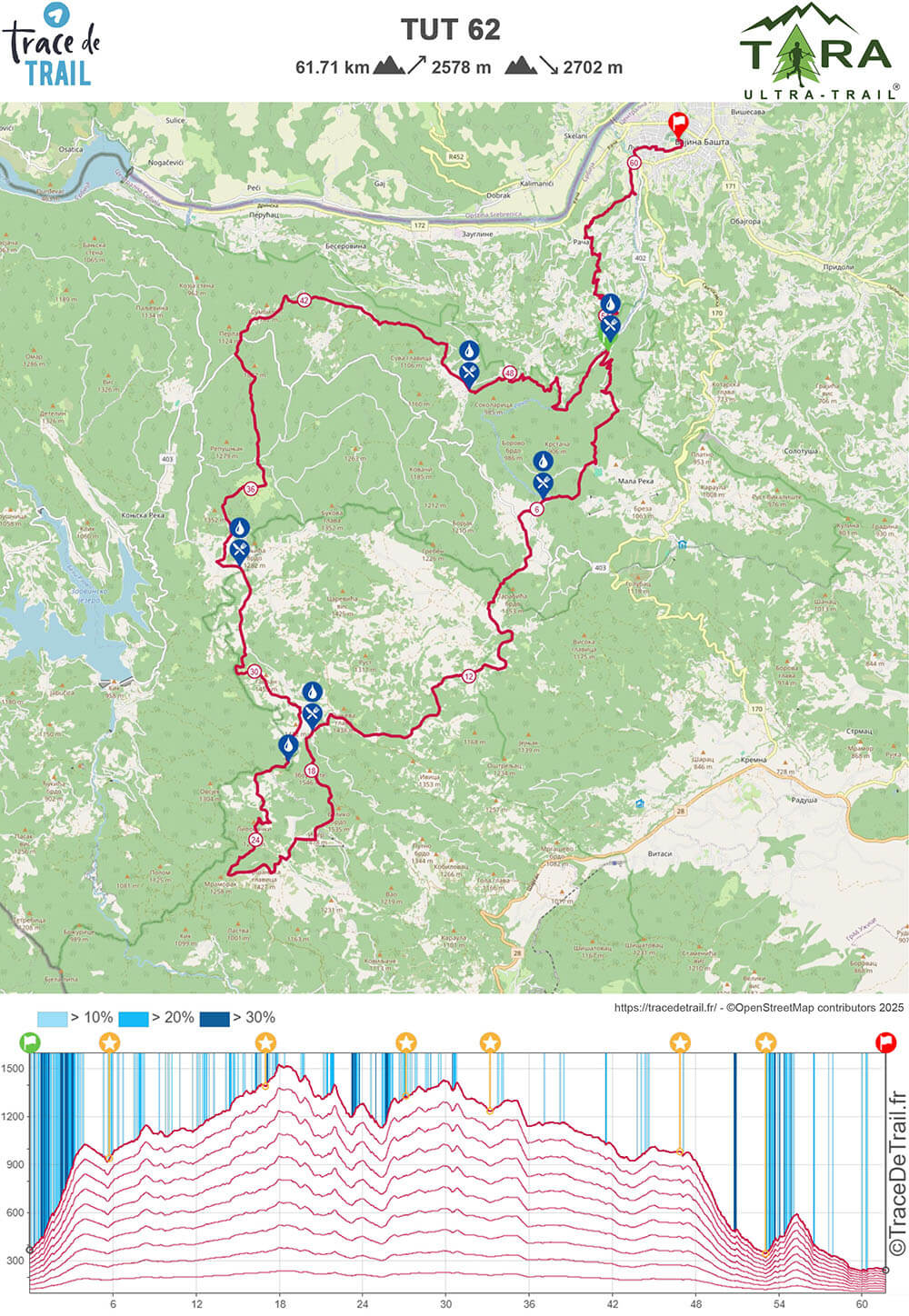 Ovo je naša najprepoznatljivija trka – 62 km sa oko 2.600 m kumulativnog uspona. Start je kod manastira Rača, odakle staza vodi kroz skrivene i živopisne delove Nacionalnog parka Tara, sve do cilja u Bajinoj Bašti. Izazov počinje odmah. Najteži uspon na celoj trci čeka takmičare već na startu: epski uspon od manastira, preko vidikovca Crnjeskovo, pa sve do platoa Kaluđerske Bare – 4 km sa oko 700 m uspona. Zatim sledi brz spust od 1.5 km do jezera Jarevac.